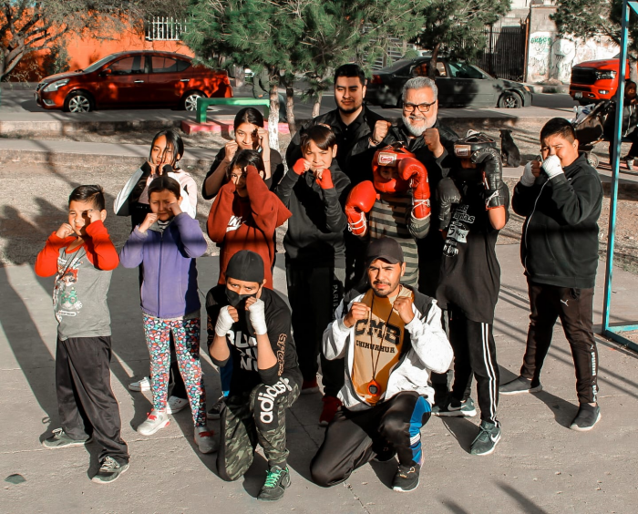Chihuahua, Chih.- Continuando con sus trabajos en apoyo a las y los deportistas chihuahuenses, el regidor Alejandro Morán Quintana (PT) acompañó en su entrenamiento y llevó apoyos alimentarios para las familias de integrantes del Club de Box Santa Cecilia.