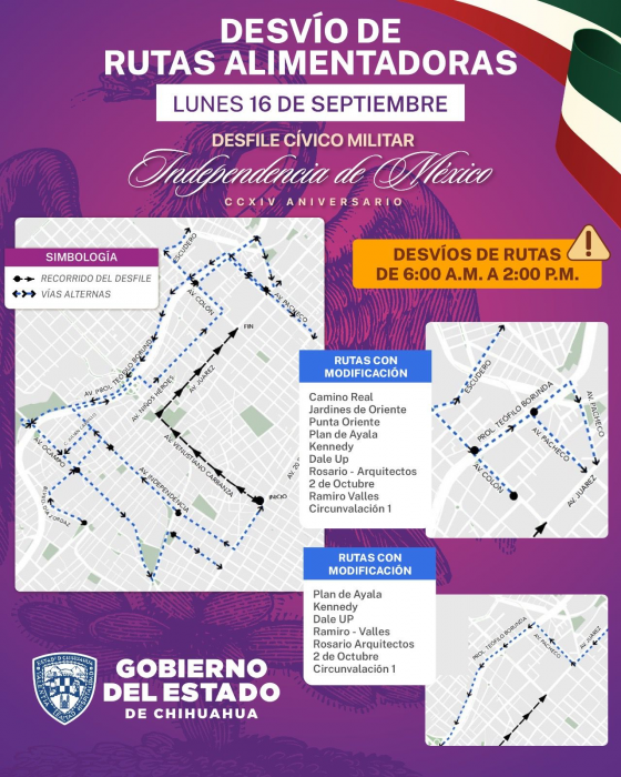 Por FELAChihuahua, Chih.- Este lunes 16 de septiembre habrá modificaciones en los recorridos del centro de la ciudad en un horario de 6 de la mañana a 2 de la tarde.