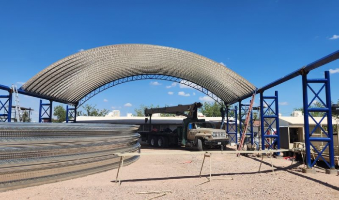 Hasta la fecha se realizaron trabajos de excavaciones, construcción de zapatas y dados, colocación de columnas, vigas y armaduras para domo metálico en un área de 480 metros cuadrados, así como también la instalación de lámina galvanizada.