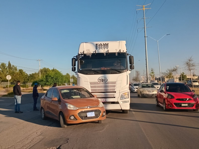 Un tráiler impactó a un vehículo compacto Hyundai que intentaba incorporarse a la avenida desde un fraccionamiento cercano, lo que provocó que la Policía Vial desplegara un operativo de abanderamiento para dirigir el tráfico.