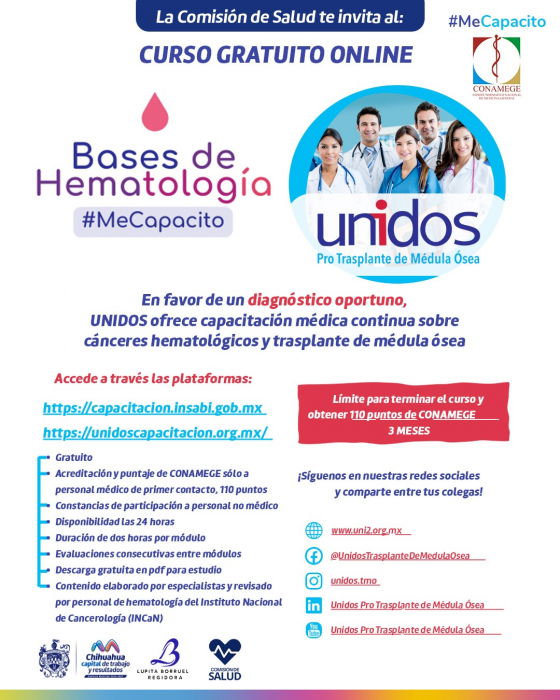 El curso tiene como objetivo capacitar al personal médico para diagnosticar oportunamente cánceres hematológicos y determinar quiénes requieren un trasplante de médula ósea. Avalado por el Instituto Nacional de Cancerología (InCaN), se otorgarán 110 puntos de CONAMEGE y una constancia de participación al finalizar.