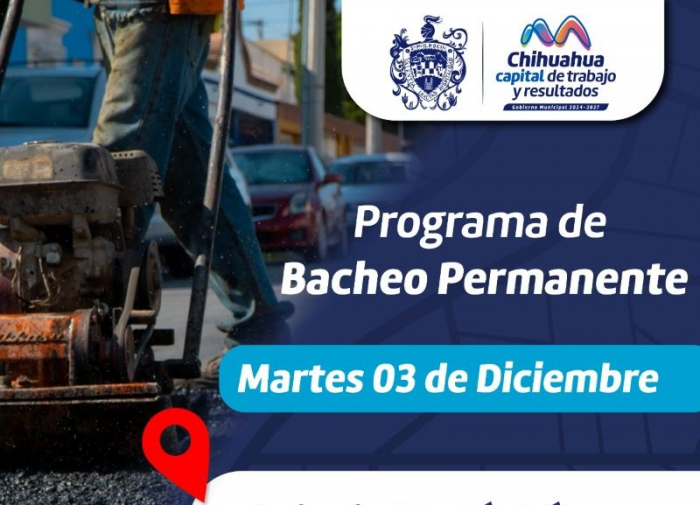 Chihuahua, Chih.- El Gobierno Municipal por medio de la Dirección de Obras Públicas, informa que el día de hoy intervendrá con trabajos de bacheo en las colonias 2 de Octubre, Esperanza, Ladrilleros y Martín López.