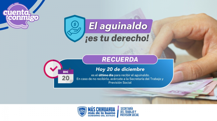 Chihuahua, Chih.- Invitan a los traba Secretaría del Trabajo y Previsión Social (STPS) informó a las y los trabajadores de Chihuahua, que hoy 20 de diciembre de 2024 es el último día para recibir la prestación del aguinaldo, por lo que deberán percibir un mínimo de 15 días de sueldo por año laborado, o bien el monto proporcional al tiempo que se haya trabajado.
