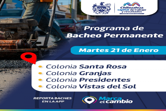 Chihuahua, Chih.- El Gobierno Municipal, intervendrá con bacheo este 21 de enero en calles de las colonias Santa Rosa, Granjas, Presidentes y Vistas del Sol.Las cuadrillas de bacheo comenzaran labores a partir de las 8:00 a 13:00 horas en calles secundarias y de 10:00 a 13:00 horas en avenidas principales de la capital.