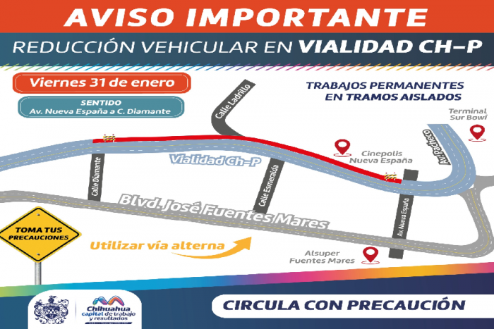 - Se repondrán losas de concreto para una mejor circulaciónChihuahua, Chih.- El Gobierno Municipal, por medio de la Dirección de Obras Públicas, informa que a partir del viernes 31 de enero se reducirá la circulación vehicular en vialidad CH-P, en tramos aislados desde la avenida Nueva España a calle Diamante, por el inicio de reposición de losas de concreto, por lo que se exhorta a conducir con precaución por las zonas de trabajo.