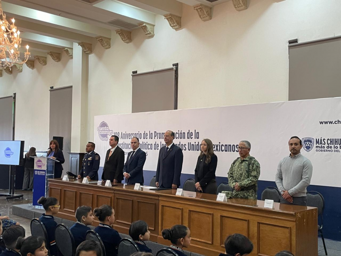 CHIHUAHUA, Chih. 5 de febrero de 2025.- Esta mañana de miércoles en una ceremonia cívica realizada en el Salón 25 de Marzo, se celebró el CVIII Aniversario de la Promulgación de la Constitución Política de los Estados Unidos Mexicanos de 1917, la carta magna que rige la vida jurídica del país.Contando con la presencia de 120 asistentes , entre ellos 80 alumnos de 5° grado de primaria de instituciones educativas pertenecientes a ambos subsistemas.