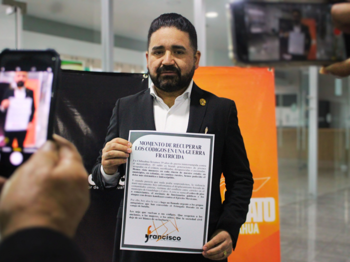 Por FELAChihuahua, Chih.- En Chihuahua llevamos 19 años de guerra ininterrumpida contra el narcotráfico. El saldo es brutal: generaciones de jóvenes atrapadas en el crimen, sacrificadas, asesinadas. Así lo declaró el diputado y coordinador de la Bancada Naranja de Movimiento Ciudadano, Francisco Sánchez Villegas, al presentar una carta abierta a los grupos del crimen organizado para que recuperen los códigos y cese el derramamiento de sangre inocente en Chihuahua.