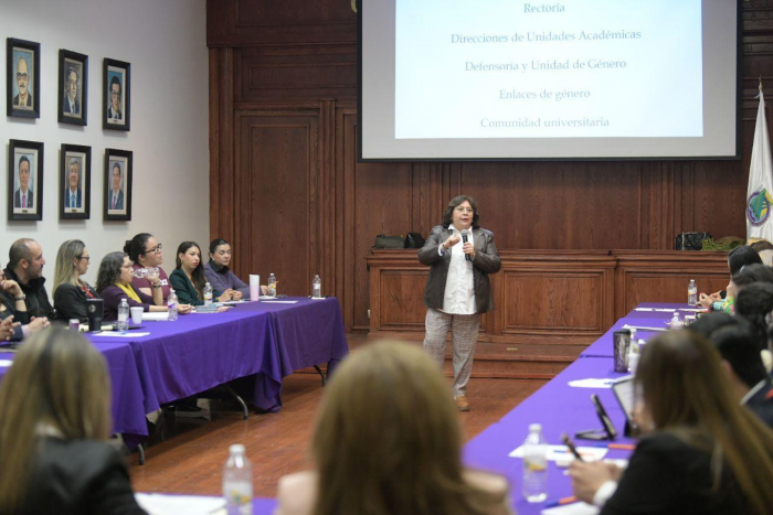 La Mtra. Liz Aguilera García, directora de la Defensoría de los Derechos Universitarios, Igualdad y Atención a la Violencia de Género de la UACH, destacó la importancia de conocer las funciones y atribuciones de los enlaces de género y remarcó que mensualmente, estos se reúnen para abordar temas relevantes para la comunidad universitaria.