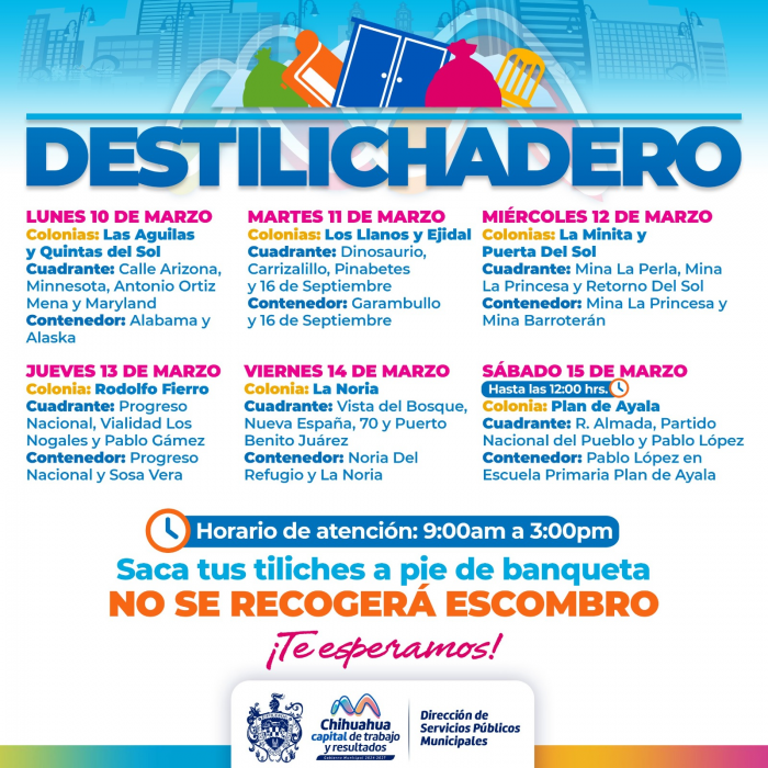 Chihuahua, Chih.- Para evitar acumulaciones de basura de grandes dimensiones en las viviendas, que podría generar plagas o problemas de salud, el Gobierno Municipal, a través de la Dirección de Servicios Públicos Municipales, informa el calendario del programa Destilichadero, que se realizará del 10 al 15 de marzo en siete colonias de la Capital.