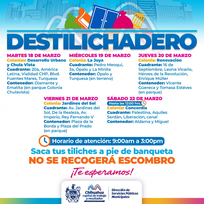 Por FELAChihuahua, Chih.- Para evitar acumulaciones de basura de grandes dimensiones en las viviendas, que podría generar plagas o problemas de salud, el Gobierno Municipal, a través de la Dirección de Servicios Públicos Municipales, informa el calendario del programa Destilichadero, que se realizará del 18 al 22 de marzo en seis colonias de la Capital.