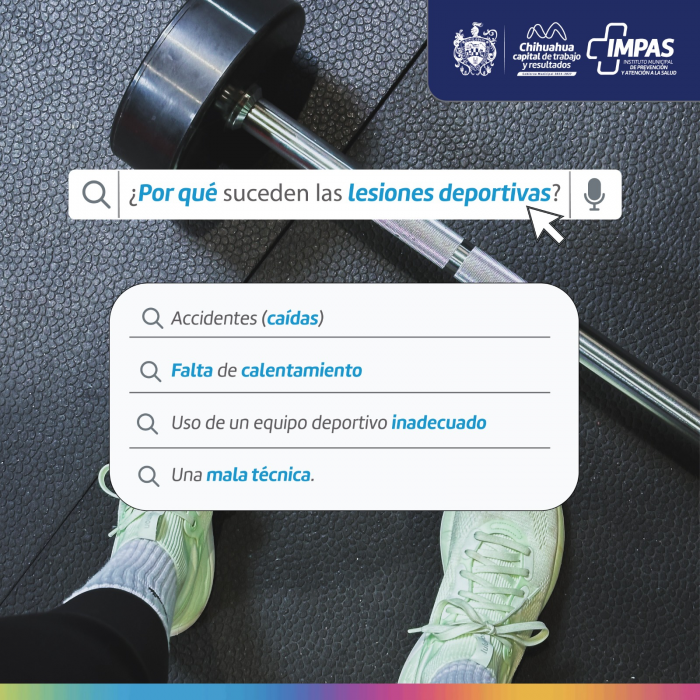 Por FELAChihuahua, Chih.- El Gobierno Municipal, a través del Instituto Municipal de Prevención y Atención a la Salud (IMPAS), emite a la comunidad deportiva las formas comunes en la que pueden ocasionarse lesiones, así como los tratamientos indicados para una recuperación exitosa y la prevención de futuras lesiones.