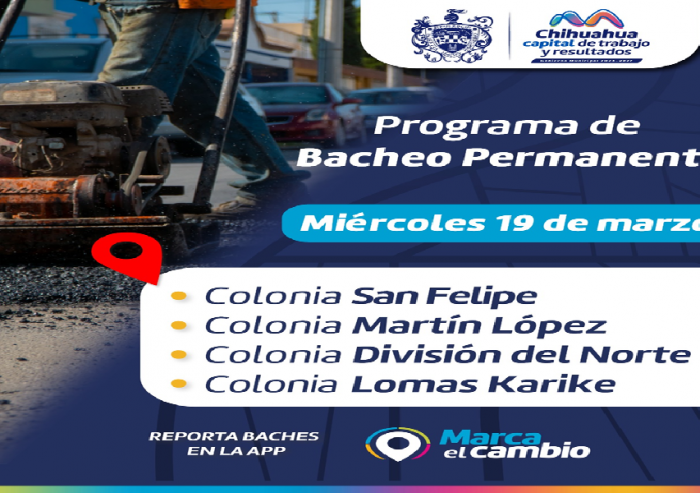 Chihuahua, Chih.- El Gobierno Municipal, a través de la Dirección de Obras Públicas, trabajará con bacheo este 19 de marzo en calles de las colonias San Felipe, Martín López, División del Norte y Lomas Karike.Estas labores se realizan en diferentes tramos en un horario de 10:00 a 13:00 horas, en avenidas principales de los cuatro cuadrantes de la ciudad y de 8:00 a 13:00 horas en calles secundarias.
