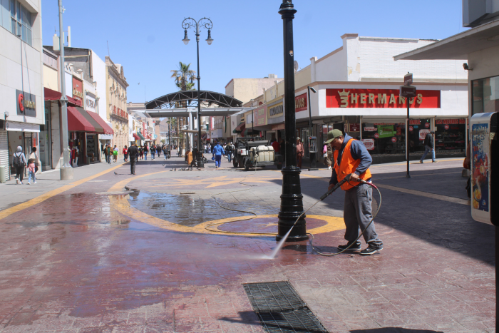 Dada la afluencia de visitantes al primer cuadro de la Capital del estado, personal de la mencionada dependencia, efectúa labores de limpieza en tres turnos laborales.