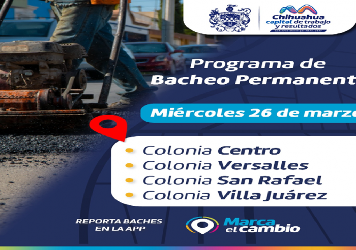 Chihuahua, Chih.- El Gobierno Municipal, a través de la Dirección de Obras Públicas, informa que hoy 26 de marzo se tendrá bacheo en calles de las colonias Centro, San Rafael, Villa Juárez y VersallesEstas labores se realizarán en diferentes tramos en un horario de 10:00 a 13:00 horas en avenidas principales de los cuatro cuadrantes de la ciudad, y de 8:00 a 13:00 horas en calles secundarias.