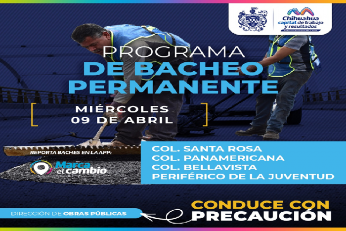 El Gobierno Municipal, por medio de la Dirección de Obras Públicas, informa que este miércoles se tendrán labores de bacheo en las colonias Santa Rosa, Panamericana y Bellavista, así como en el Periférico de la Juventud.Los horarios de las cuadrillas serán de 8:00 a 13:00 horas en calles secundarias y de 10:00 a 13:00 horas en avenidas principales.