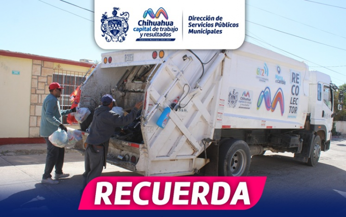 Chihuahua, Chih.- El Gobierno Municipal, a través de la Dirección de Servicios públicos Municipales, recuerda a la población en general que el servicio de recolección de basura se suspenderá este viernes 18 y sábado 19 de abril.