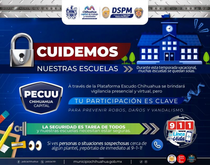 “La corporación permanecerá muy atenta en cuanto a la vigilancia presencial y virtual, por medio de las cámaras de la Plataforma Escudo Chihuahua Capital (PECUU), pero reiteramos que la colaboración de las y los ciudadanos es elemental para evitar robos, daños materiales, pintas y otros delitos en las instalaciones escolares”, recalcó el funcionario.