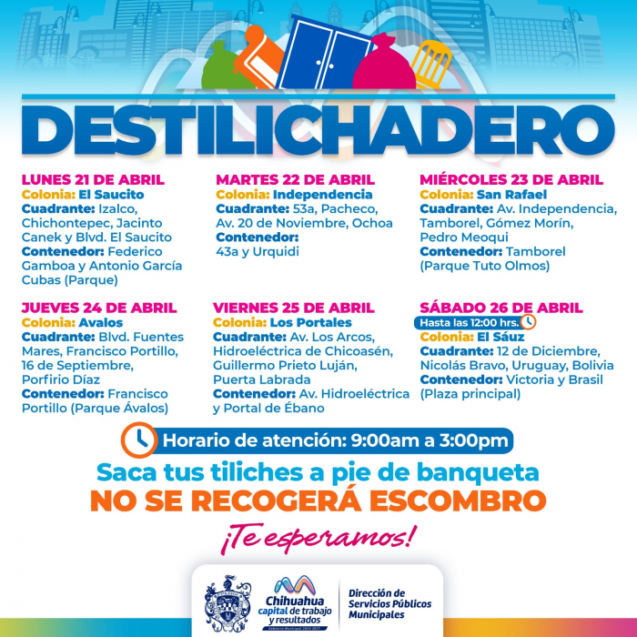 Por FELAH. Ciudad de Chihuahua, Chih.- Para evitar acumulaciones de basura de grandes dimensiones en las viviendas, que podría generar plagas o problemas de salud, el Gobierno Municipal, a través de la Dirección de Servicios Públicos Municipales, informa el calendario del programa Destilichadero, que se realizará del 21 al 26 de abril en seis colonias de la Capital.