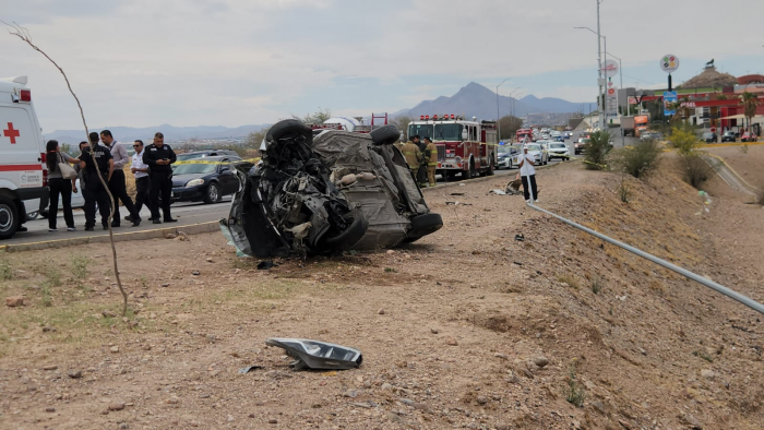 Chihuahua, Chih.- Una aparatosa volcadura se registró esta mañana en el kilómetro 4 de la carretera Chihuahua-Aldama, donde un vehículo Nissan Versa, perteneciente a la empresa City Gates del aeropuerto, terminó fuera de la cinta asfáltica.El conductor perdió el control del automóvil, impactando de manera violenta contra un poste, lo que provocó que quedara atrapado en el interior de la unidad.
