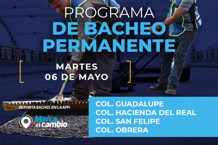 El Gobierno Municipal, por medio de la Dirección de Obras Públicas, informa que este viernes se tendrán labores de bacheo en las colonias Guadalupe, San Felipe, Obrera y Hacienda del Real.Los horarios de las cuadrillas serán de 8:00 a 13:00 horas en calles secundarias y de 10:00 a 13:00 horas en avenidas principales.