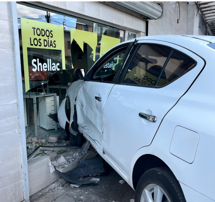 Chihuahua, Chih.- Un aparatoso accidente vial se registró en la calle Jesús Neri Santos, luego de que una conductora presuntamente no respetara la luz roja del semáforo, provocando un choque que terminó con un vehículo incrustado en un local comercial.