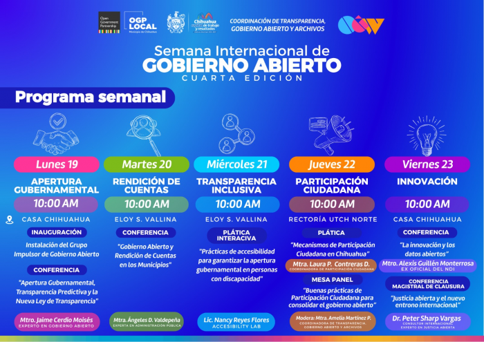 Con el firme compromiso de seguir construyendo un gobierno cercano, transparente y participativo, el Gobierno Municipal de Chihuahua invita a toda la ciudadanía a formar parte de la Semana de Gobierno Abierto 2025, iniciativa global impulsada por la Alianza para el Gobierno Abierto (Open Government Week) que se llevará a cabo del 19 al 23 de mayo en distintos espacios de la ciudad.Este esfuerzo internacional busca fortalecer los valores de apertura gubernamental, rendición de cuentas, transparencia inclusiva, participación ciudadana e innovación, a través de actividades que promuevan el diálogo entre gobierno y sociedad civil, con el fin de hacer comunidades más fuertes, justas y responsables.