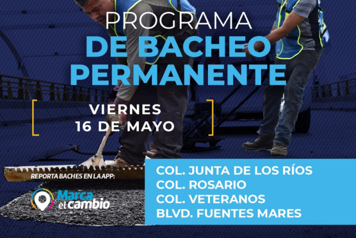 - Se invita a los ciudadanos a seguir reportando bachesChihuahua, Chih.- El Gobierno Municipal a través de la Dirección de Obras Públicas, realizarán trabajos de bacheo el día de hoy en el boulevard Fuentes Mares y en las colonias Junta de los Ríos, Rosario y Veteranos.