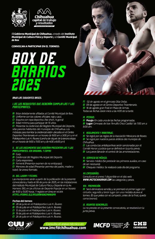 Chihuahua, Chih.- El Gobierno Municipal de Chihuahua a través del Instituto Municipal de Cultura Física y Deporte, en coordinación con el Comité Municipal de Boxeo dan a conocer la convocatoria para el Torneo Municipal “Box de Barrios” 2025.
