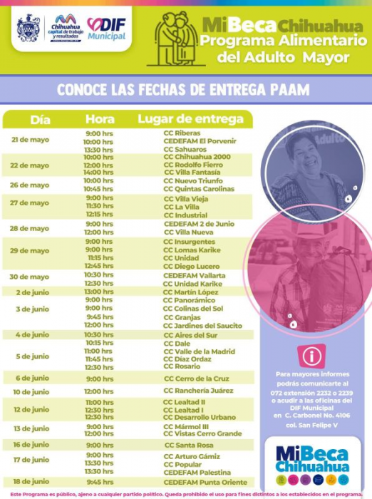 Chihuahua, Chih.- En atención al compromiso que el Gobierno Municipal tiene con las y los adultos mayores de Chihuahua Capital, para garantizarles una mejor calidad de vida, a través del DIF, se informa a las y los seleccionados del Programa Alimentario del Adulto Mayor (PAAM) 2025, las fechas en las que podrán acudir a su Centro Comunitario: