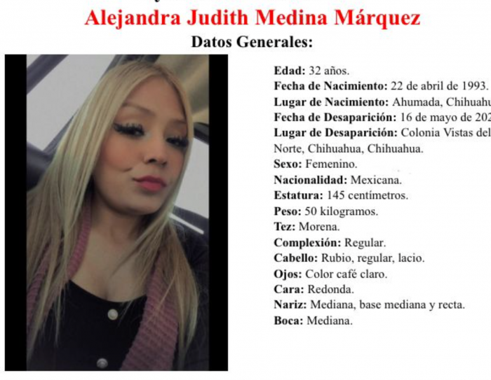 Chihuahua, Chih.- Una mujer que había sido reportada como desaparecida el pasado 16 de mayo fue localizada sin vida dentro de un vehículo Nissan Sentra gris, modelo 2006, con heridas causadas por arma blanca.La víctima fue identificada como Alejandra Judith Medina Márquez, de 32 años, y su cuerpo fue encontrado este domingo en el cruce de las calles Valle de la Concha y Valle de Columbia, en la colonia Granjas del Valle.