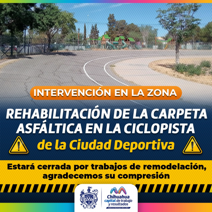 Por FELAH. Ciudad de Chihuahua, Chih.- El Gobierno Municipal, a través de la Dirección de Obras Públicas informa que, debido a los próximos trabajos de remodelación, la ciclopista ubicada en la Ciudad Deportiva estará cerrada hasta nuevo aviso. Cabe señalar que este proyecto fue uno de los ganadores del Distrito 15 en el Presupuesto Participativo 2025.