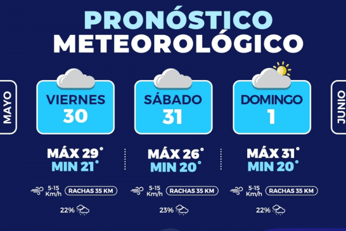 El sábado se espera temperatura máxima de 26°C y mínima de 20°C, con cielos nublados y 23 por ciento de probabilidad de lluvia por la mañana y finalmente para el domingo se espera temperatura máxima de 31°C y mínima de 20°C, con cielos parcialmente nublados y 22 por ciento de probabilidad de lluvia por la tarde.