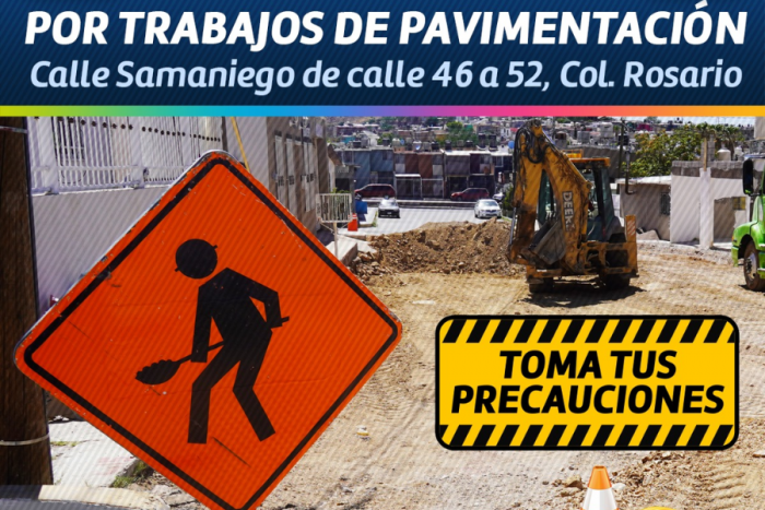 El Gobierno Municipal, a través de la Dirección de Obras Públicas, informa que el próximo lunes iniciará la pavimentación en calle Samaniego, en el tramo entre las calles 46 a la 52 de la colonia Rosario, ya que fue uno de los proyectos ganadores del distrito 16 en el Presupuesto Participativo 2025.Se exhorta a la ciudadanía a circular con precaución y tomar rutas alternas, por ejemplo, utilizar las calles Ochoa y J.J. Calvo, mientras que la ruta de transporte público que normalmente transita por la calle Samaniego, sufrirá un desvió hacia la calle J.J. Calvo.