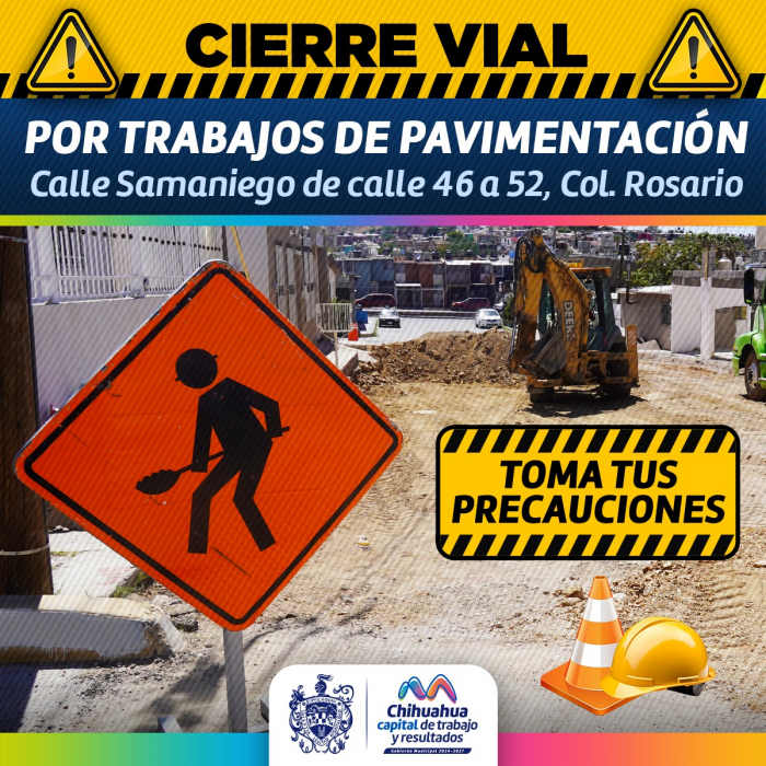 Chihuahua, Chih.- El Gobierno Municipal, a través de la Dirección de Obras Públicas, recuerda que mañana inicia la pavimentación en la calle Samaniego, proyecto ganador del Presupuesto Participativo 2025, por lo que se exhorta a la ciudadanía a circular con precaución y tomar rutas alternas ya que durante esta semana habrá un cierre parcial en el sector.El tramo en que se intervendrá es de la calle 46 a la 52 de la colonia Rosario, por lo que la circulación vehicular alterna en la zona se podrá realizar por las calles Ochoa y J.J. Calvo, mientras que la ruta de transporte público que normalmente transita por la calle Samaniego sufrirá un desvió hacia la calle J.J. Calvo.
