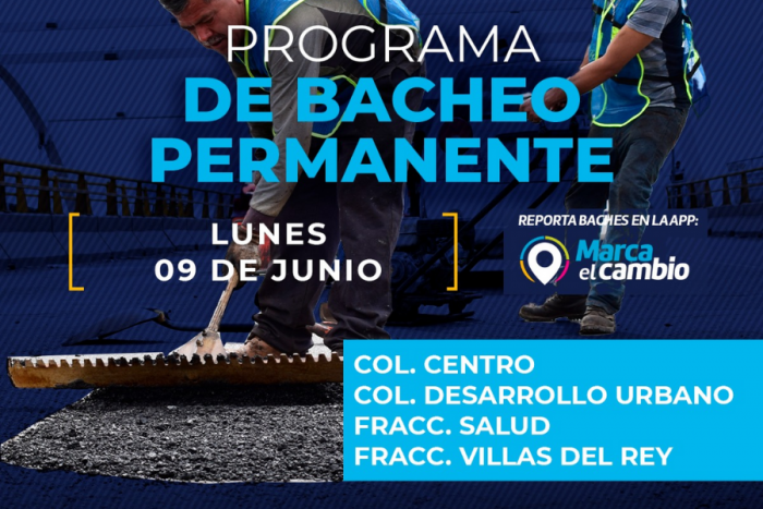 El Gobierno Municipal a través de la Dirección de Obras Públicas, realizará trabajos de bacheo el día de hoy en las colonias Centro y Desarrollo Urbano, así como en los Fraccionamientos Salud y Villas del Rey.Para seguridad de conductores, se exhorta a tomar precauciones por las labores que realizarán en un horario de 10:00 a 13:00 horas en avenidas principales y de 8:00 a 13:00 horas en calles en calles secundarias.
