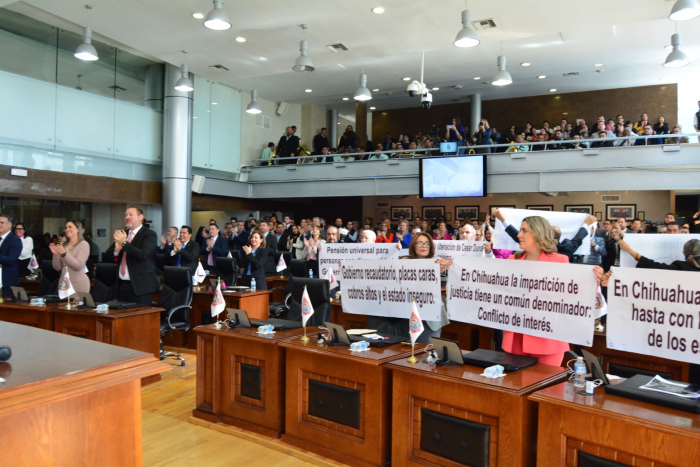 Los diputados mostraron lonas con varias consignas desde que la mandataria arribó al pleno del congreso, desde sus lugares mostraron las mantas, mientras las demás bancadas aplaudían a la gobernadora.