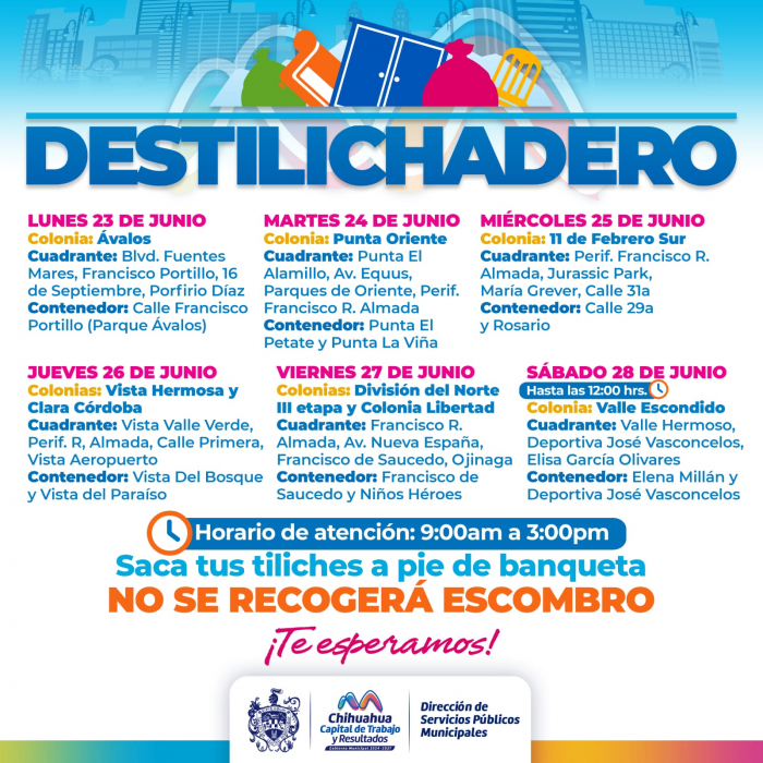 Por FELAH. Ciudad de Chihuahua, Chih.- Para evitar acumulaciones de basura de grandes dimensiones en las viviendas, que podría generar plagas o problemas de salud, el Gobierno Municipal, a través de la Dirección de Servicios Públicos Municipales, informa el calendario del programa Destilichadero, que se realizará del 23 al 28 de junio en ocho colonias de la Capital.