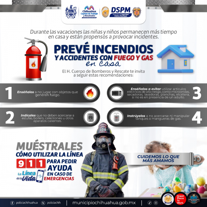 Por FELAChihuahua, Chih.- Con el inicio de las vacaciones y el aumento de tiempo que niñas y niños pasan en casa, el Heroico Cuerpo de Bomberos del Municipio exhorta a madres, padres y tutores a fortalecer la prevención de accidentes domésticos, especialmente incendios.