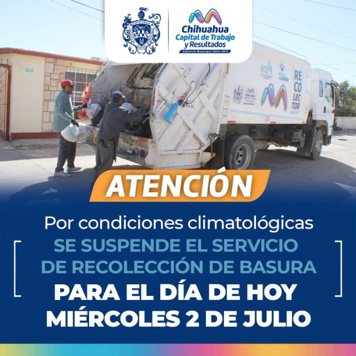 Chihuahua, Chih.- Derivado de las adversas condiciones climatológicas que se registran en la Capital del estado, el servicio de recolección de basura habitacional se verá suspendido este miércoles 2 de julio, hasta que las condiciones mejoren.