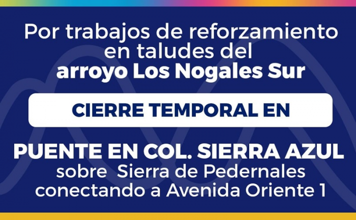Chihuahua, Chih.- El Gobierno Municipal, a través de la Dirección de Obras Públicas, informa que el puente Los Nogales ubicado entre las calles Sierra de Pedernales y la avenida Oriente 1 de la colonia Sierra Azul estará cerrado hasta nuevo aviso por trabajos de reforzamiento de los taludes.