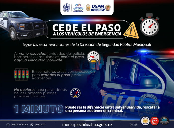 CHIHUAHUA, Chih., 18 de julio de 2025.- Con la intención de mejorar los tiempos de respuesta en la atención de emergencias de las corporaciones de auxilio, la Dirección de Seguridad Pública Municipal (DSPM) exhorta a los automovilistas a ceder el paso a vehículos como bomberas, patrullas o ambulancias.Es importante saber cómo actuar al escuchar la sirena de alguno de estos vehículos, primero para evitar accidentes y segundo para que lleguen a tiempo quienes la conducen pues pudiera tratarse de un incendio con personas atrapadas o con problemas de salud en que los minutos son fundamentales para salvar una vida.