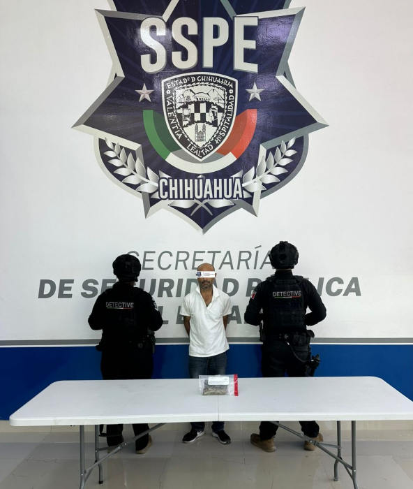 Chihuahua, Chih.- Agentes de detectives de la Secretaría de Seguridad Pública del Estado (SSPE) llevaron a cabo la detención de Raymundo M. N., de 46 años, en Ciudad Juárez, quien fue asegurado en posesión de supuesta droga. Además, el hombre contaba con un reporte de privación ilegal de la libertad.La intervención ocurrió la tarde del pasado sábado, cuando los agentes de la Subsecretaría de Estado Mayor realizaban labores de investigación relacionadas con un feminicidio ocurrido el 10 de julio, en el cual se reportó la desaparición y presunta privación de la libertad de la pareja de la víctima.