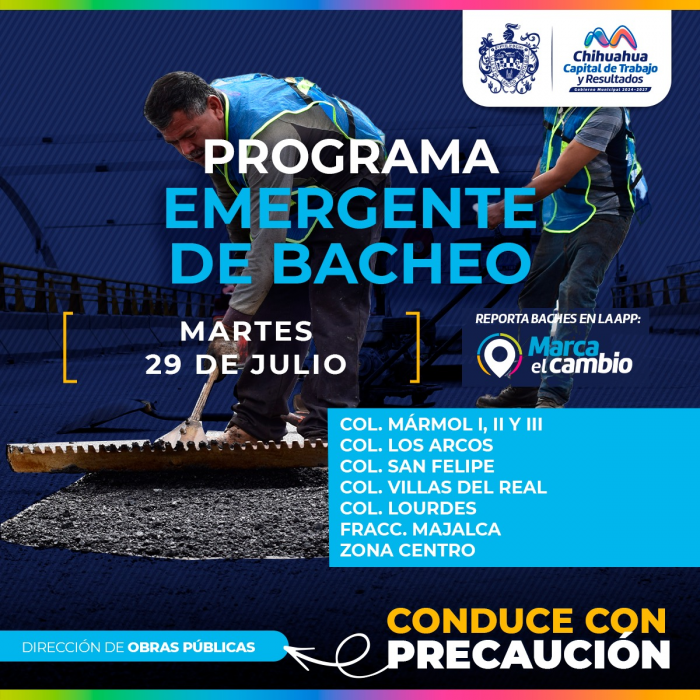 Por redacciónH. Ciudad de Chihuahua, Chih.-El Gobierno Municipal, a través de la Dirección de Obras Públicas, bacheará este 29 de julio mediante el programa emergente en las colonias Mármol I, II y III, Los Arcos, San Felipe, Villas del Real, Fraccionamiento Majalca, Lourdes y en la Zona Centro.