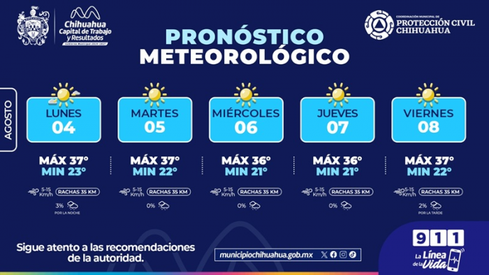 Chihuahua, Chih.- El Gobierno Municipal de Chihuahua, a través de la Coordinación Municipal de Protección Civil, informa que durante esta semana se mantendrán condiciones variables en el clima, con cielos soleados, tardes calurosas y mínimas probabilidades de lluvia.