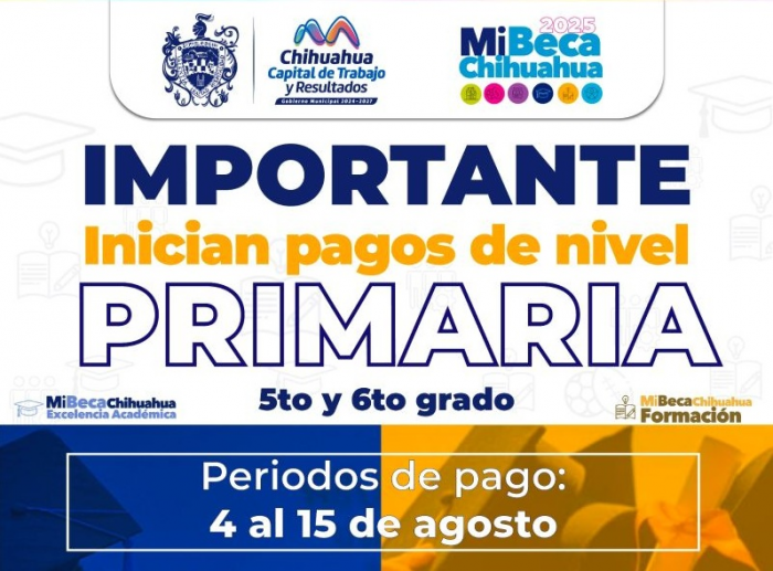 Chihuahua, Chih.- El Gobierno Municipal, a través de la Dirección de Desarrollo Humano y Educación, informa a la ciudadanía que, del 4 al 15 de agosto de 2025, se llevará a cabo el pago de becas académicas “Mi Beca Chihuahua”, en sus modalidades Excelencia Académica y Formación, dirigidas a estudiantes de quinto y sexto grado de primaria.