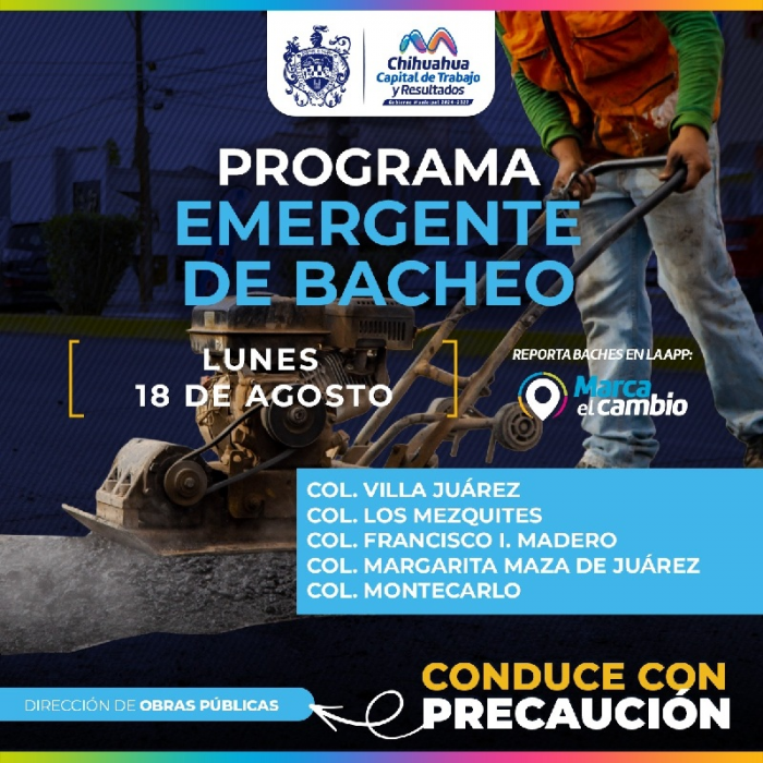Chihuahua, Chih.- El Gobierno Municipal, a través de la Dirección de Obras Públicas, trabajará con bacheo mediante el programa emergente en calles de las colonias: Villa Juárez, Los Mezquites, Francisco I. Madero, Margarita Maza de Juárez y Montecarlo.