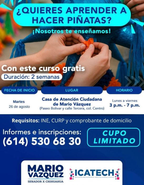 Por FELAChihuahua, Chih.– La Casa de Atención Ciudadana del senador Mario Vázquez lanzó la invitación a un curso gratuito de elaboración de piñatas, diseñado para quienes buscan emprender y generar ingresos con base en técnicas tradicionales. La capacitación, en coordinación con ICATECH, iniciará el próximo 26 de agosto y tendrá una duración de dos semanas, en horario de 3:00 a 7:00 de la tarde.