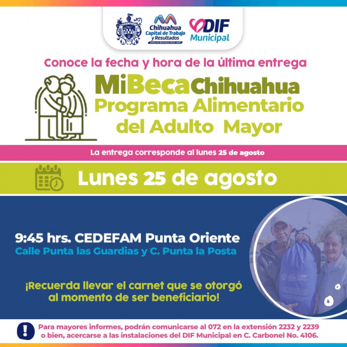 Chihuahua, Chih.- El Gobierno Municipal, a través del DIF, informó que este lunes 25 de agosto se realizará la entrega de paquetes alimentarios correspondientes al Programa Alimentario del Adulto Mayor (PAAM) en el CEDEFAM Punta Oriente, a partir de las 9:00 de la mañana.