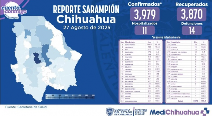 CHIHUAHUA, Chih.-En las últimas 24 horas se confirmaron siete nuevos casos de sarampión en la entidad, con lo que la cifra total llegó a 3,979 contagios, informó la Secretaría de Salud estatal. De acuerdo con el reporte, la mayoría de los pacientes han logrado superar la enfermedad, pues 3,850 ya recibieron el alta médica.Actualmente permanecen 12 personas hospitalizadas bajo vigilancia, en tanto que la cantidad de fallecimientos se mantiene en 14.
