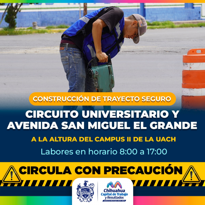 Por FELAH. Ciudad de Chihuahua, Chih. A 4 de Septiembre del 2025.- El Gobierno Municipal a través de la Dirección de Obras Públicas emite una alerta vial por el inicio de las labores de construcción del trayecto seguro entre el Circuito Universitario y la avenida San Miguel El Grande a la altura del campus 2 de la UACH, proyecto ganador del Presupuesto Participativo 2025.